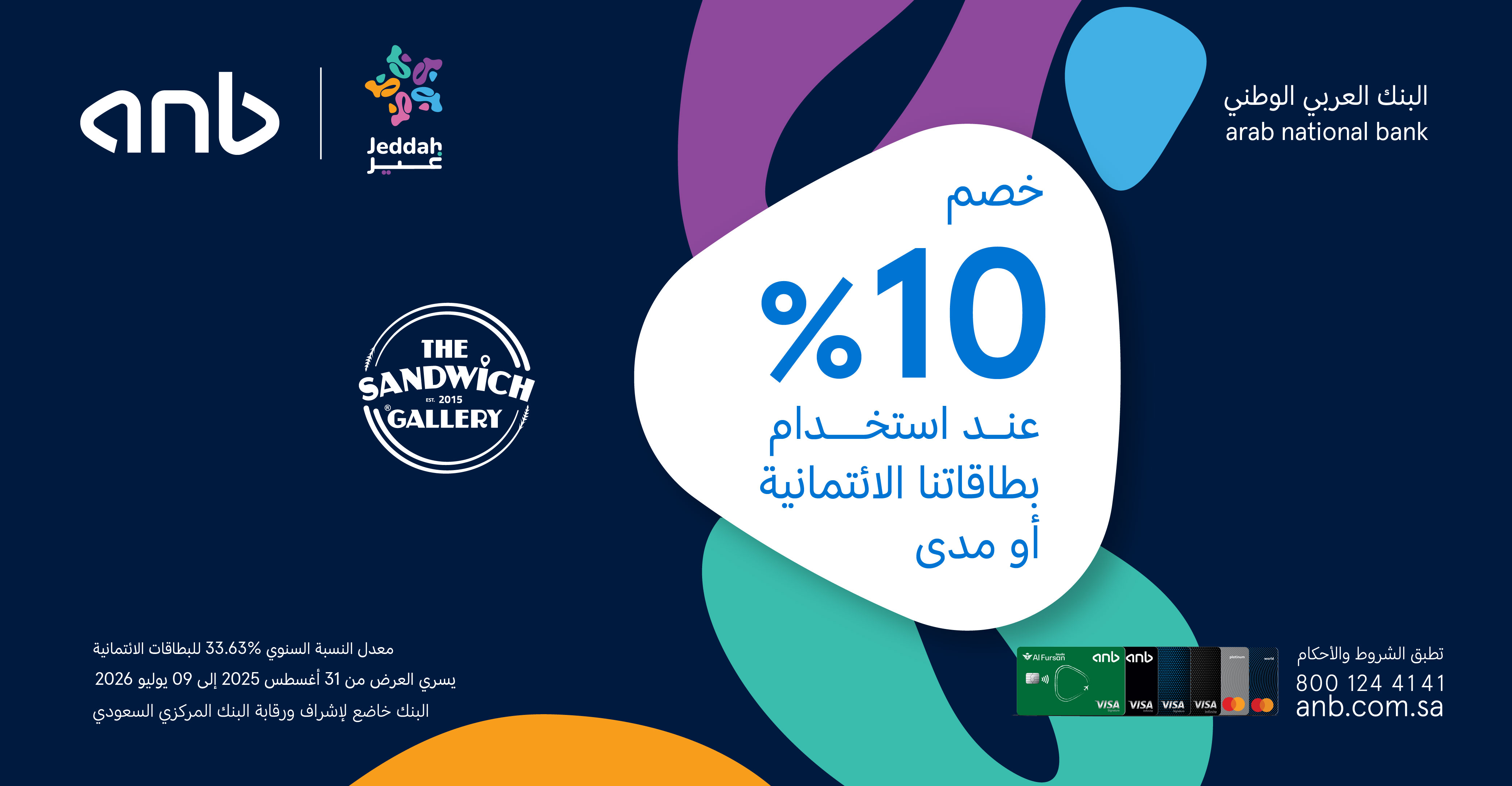 - تطبق الشروط والاحكام الخاصة بالبنك العربي الوطني anb وذا ساندويتش جاليري.