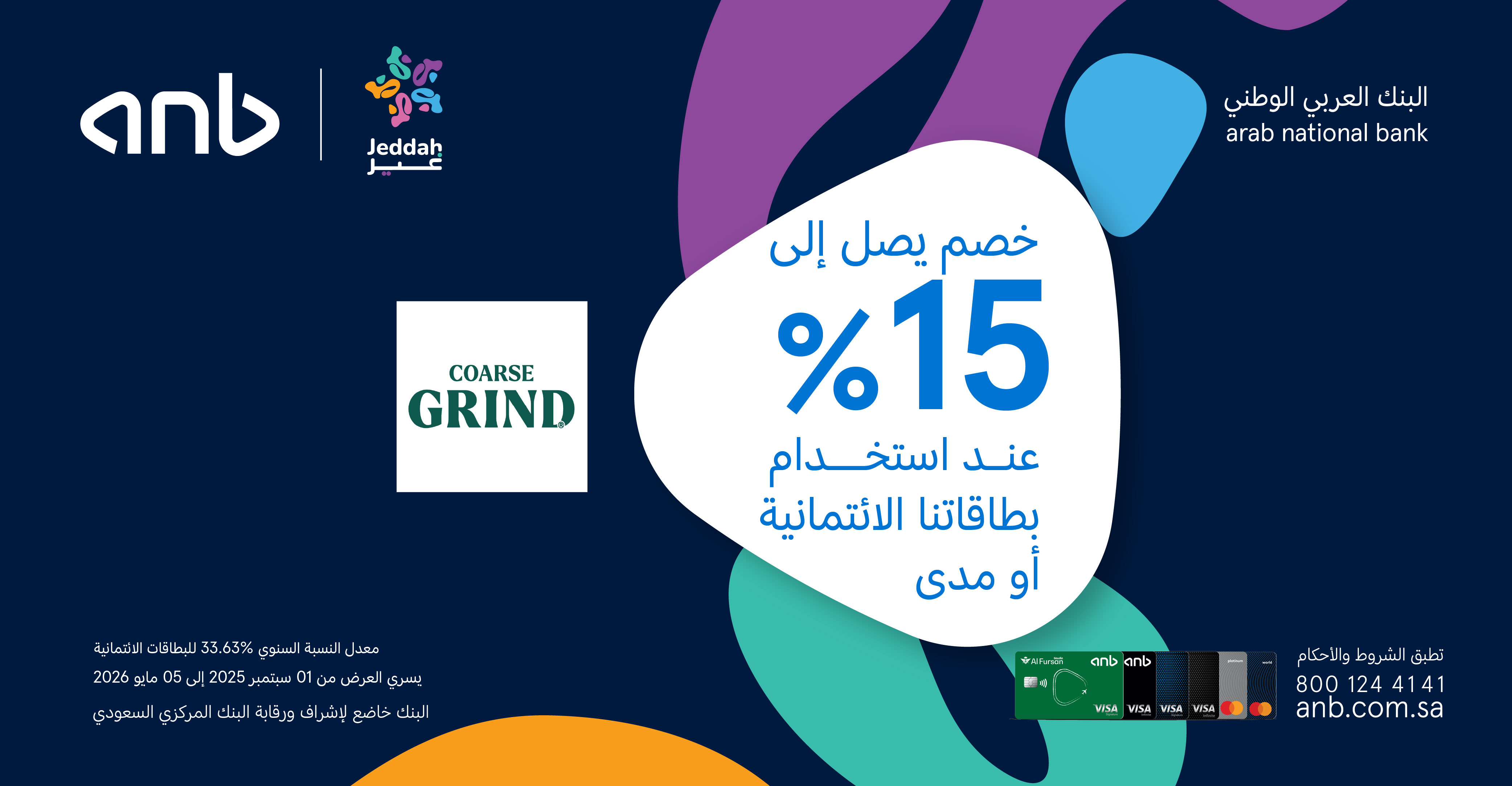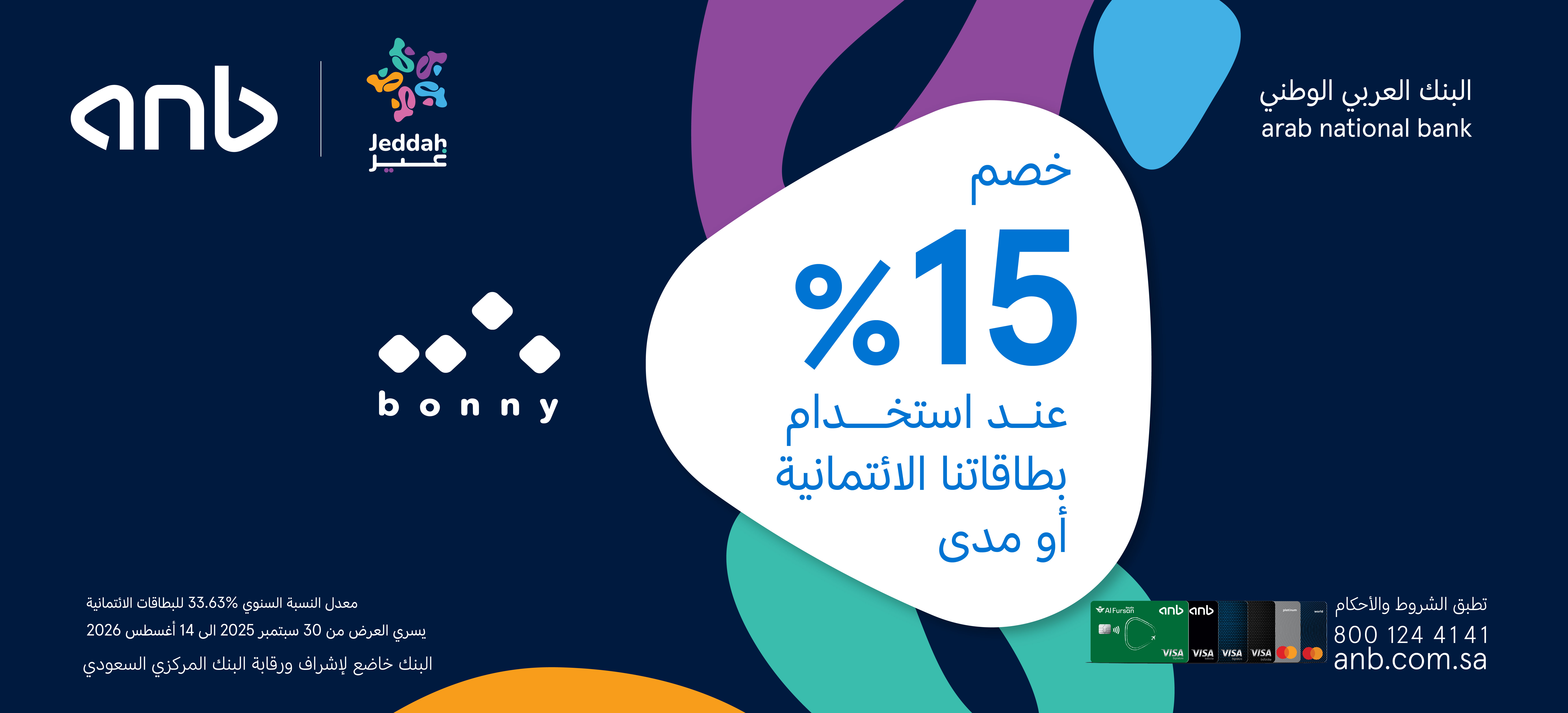 استمتع بخصم يصل الى 15% عند الدفع باستخدام بطاقات البنك العربي الوطني anb الائتمانية أو مدى.