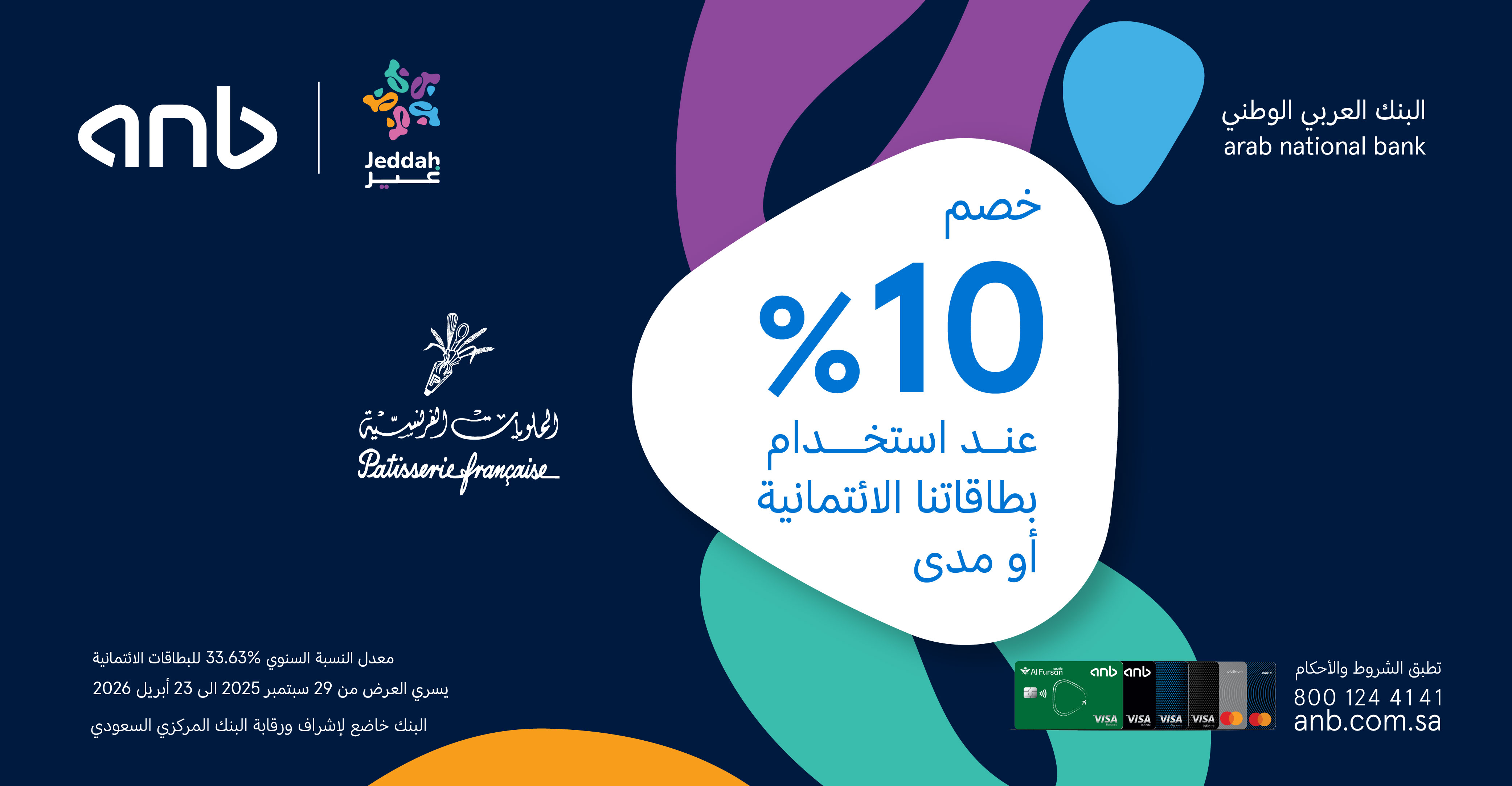 استمتع بخصم 10% عند الدفع باستخدام بطاقات البنك العربي الوطني anb الائتمانية أو مدى.