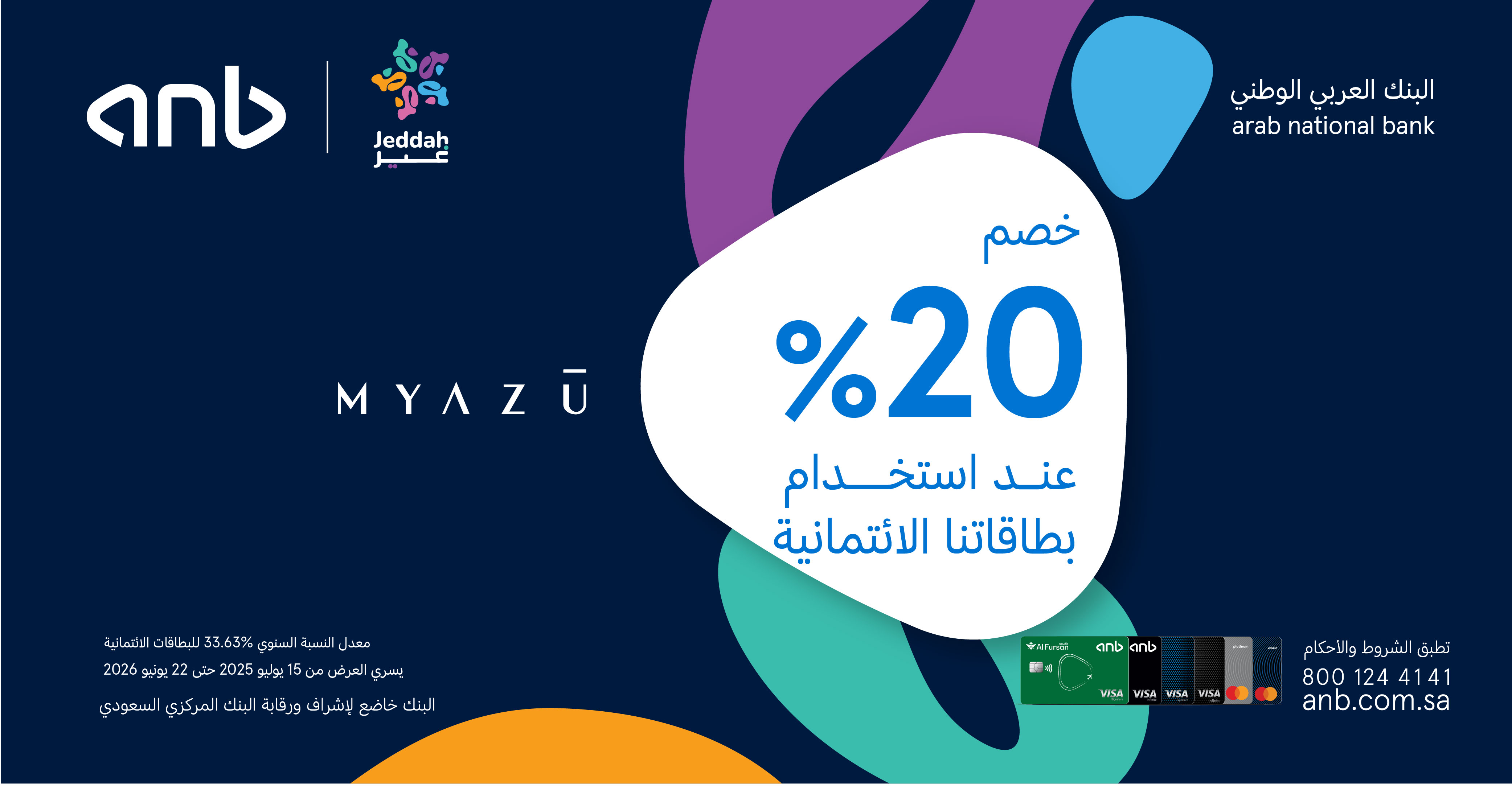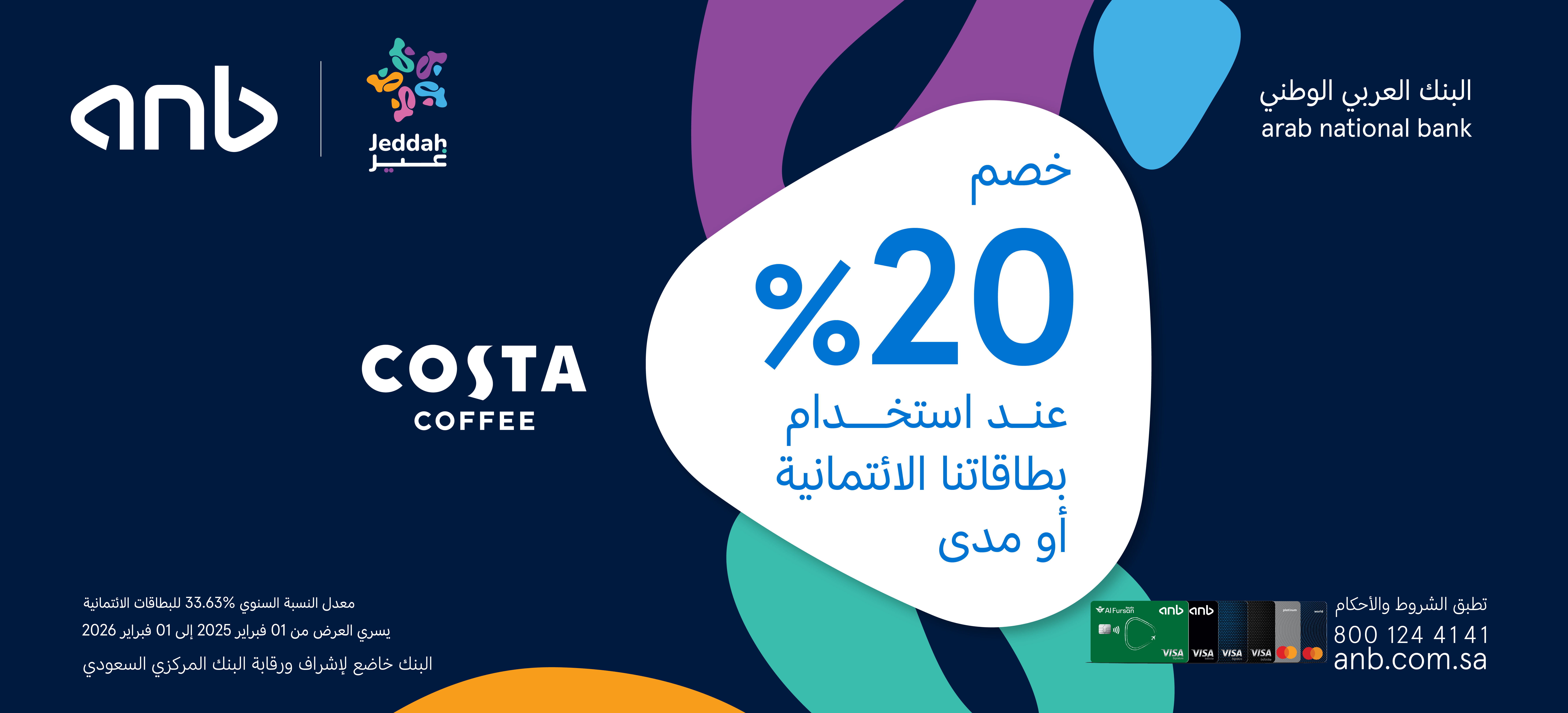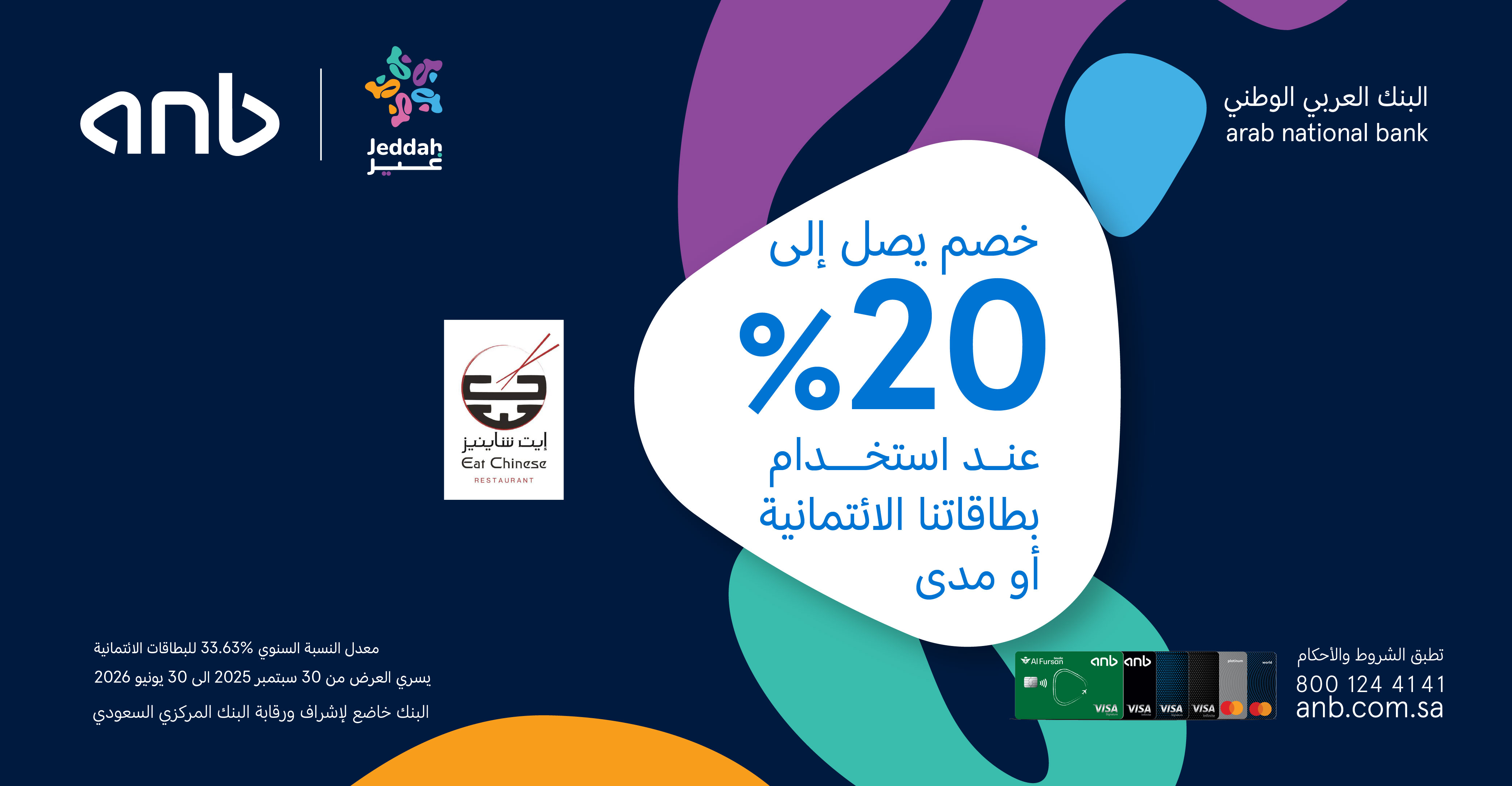 استمتع بخصم 20% عند الدفع باستخدام بطاقات البنك العربي الوطني anb الائتمانية أو مدى.