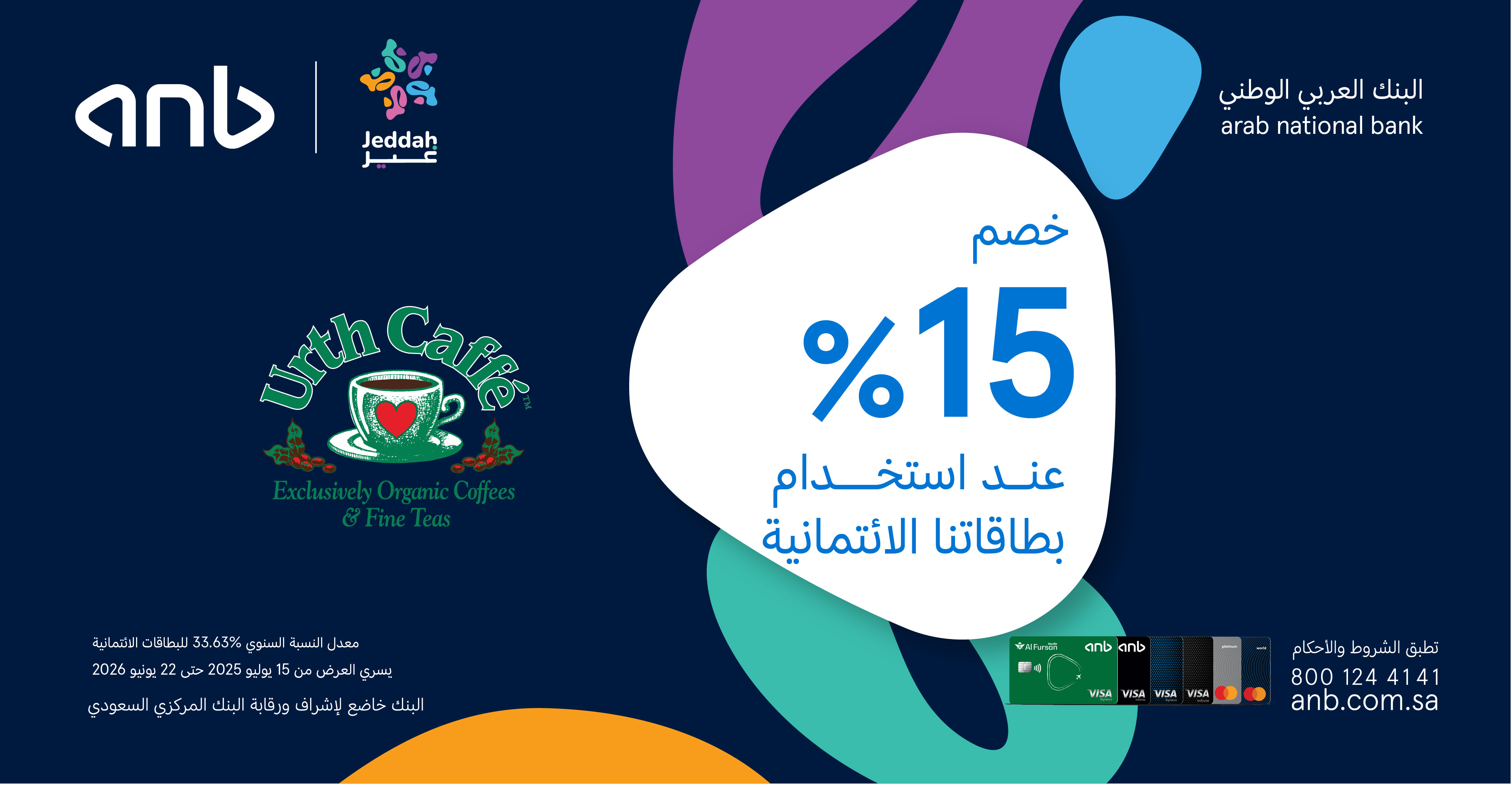 استمتع بخصم 15% عند الدفع باستخدام بطاقات البنك العربي الوطني anb الائتمانية أو مدى.