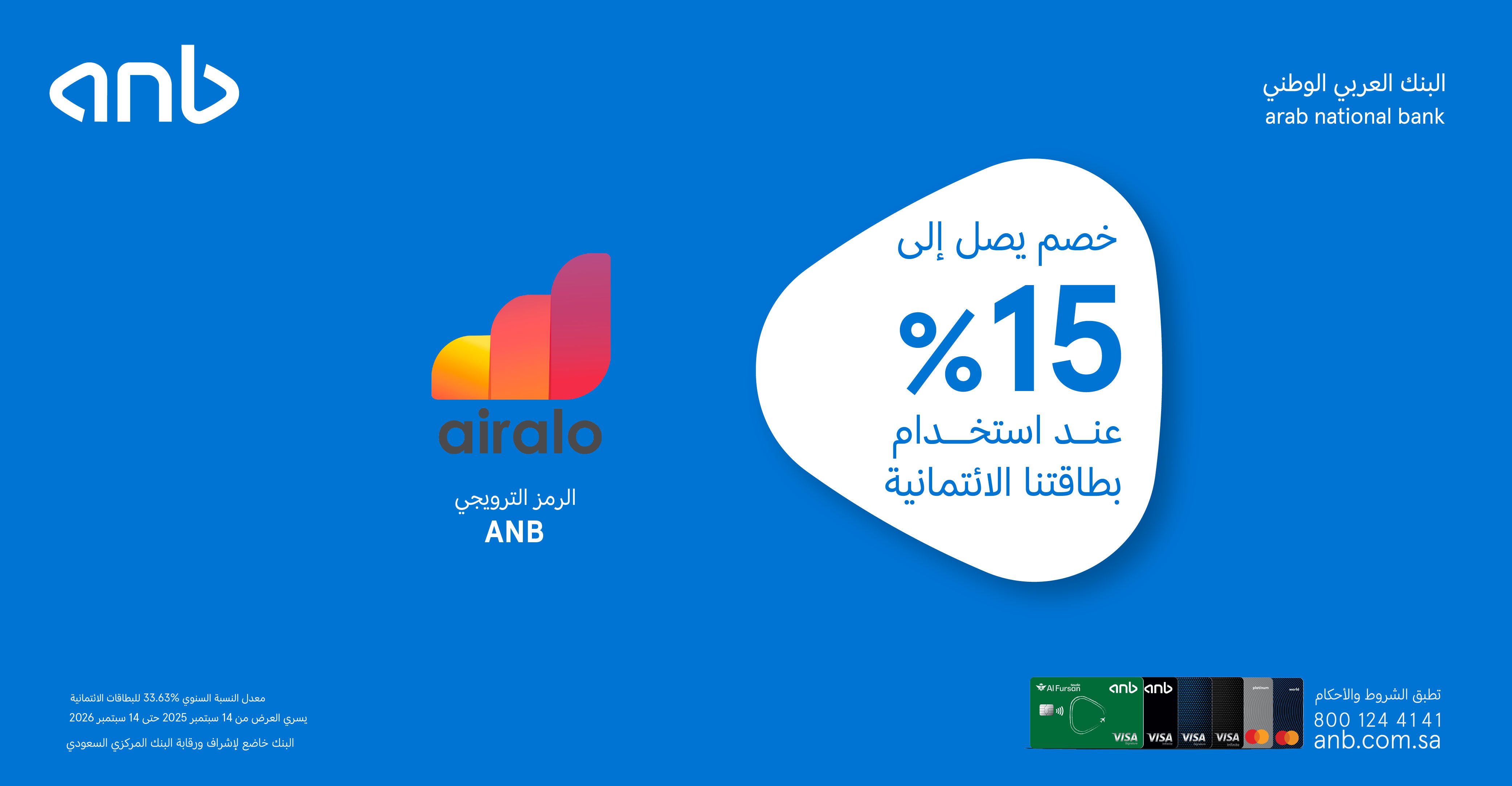 - ينطبق هذا العرض عند استخدام بطاقات البنك العربي الوطني anb الائتمانية أو بطاقات مدى فقط.