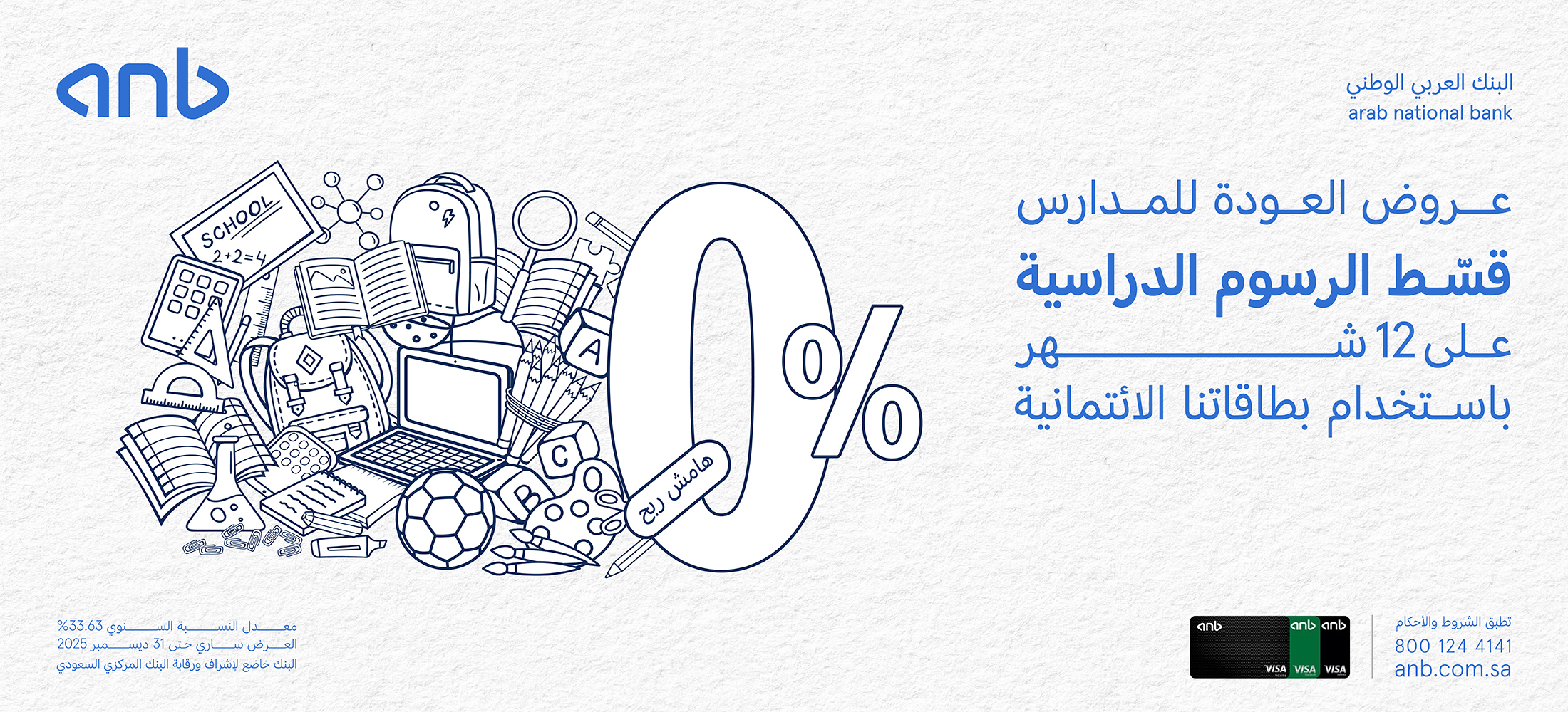8. العرض ساري لبطاقات البنك العربي الوطني anb الائتمانية باستثناء بطاقة الشركات ومسبقة الدفع والحد المنخفض ومدى.