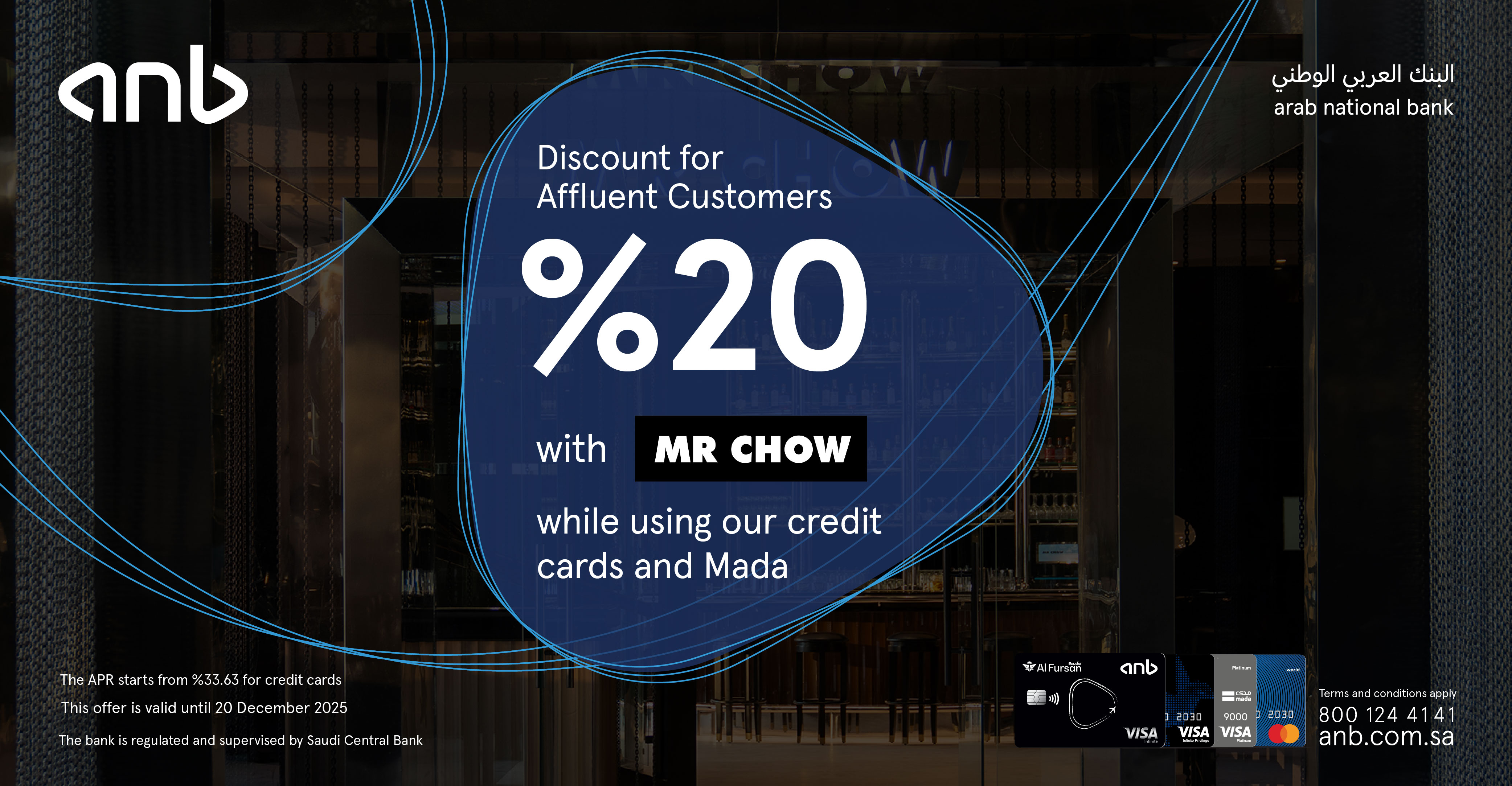 Enjoy 20% at MR CHOW restaurant for anb affluent cardholders.