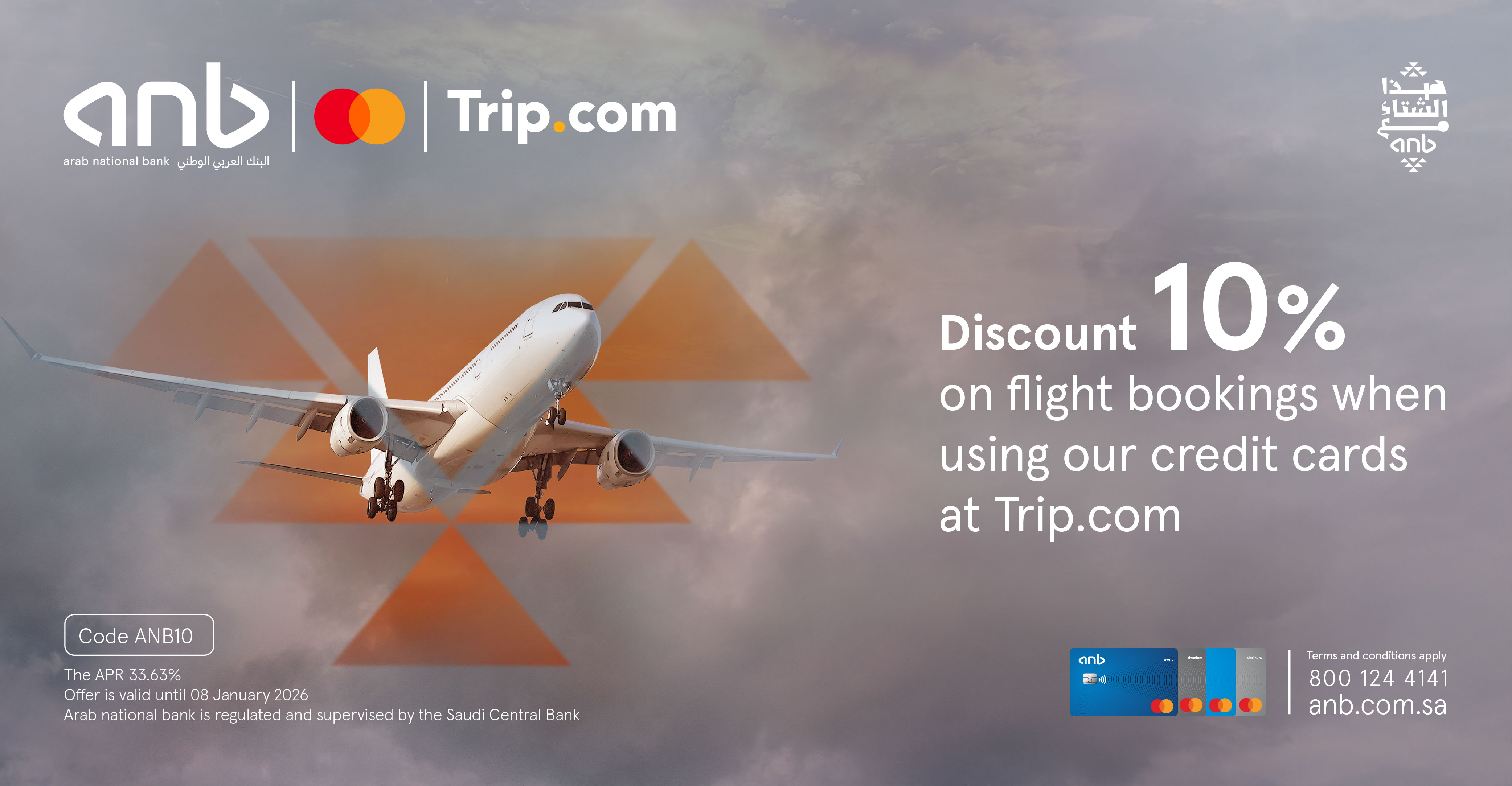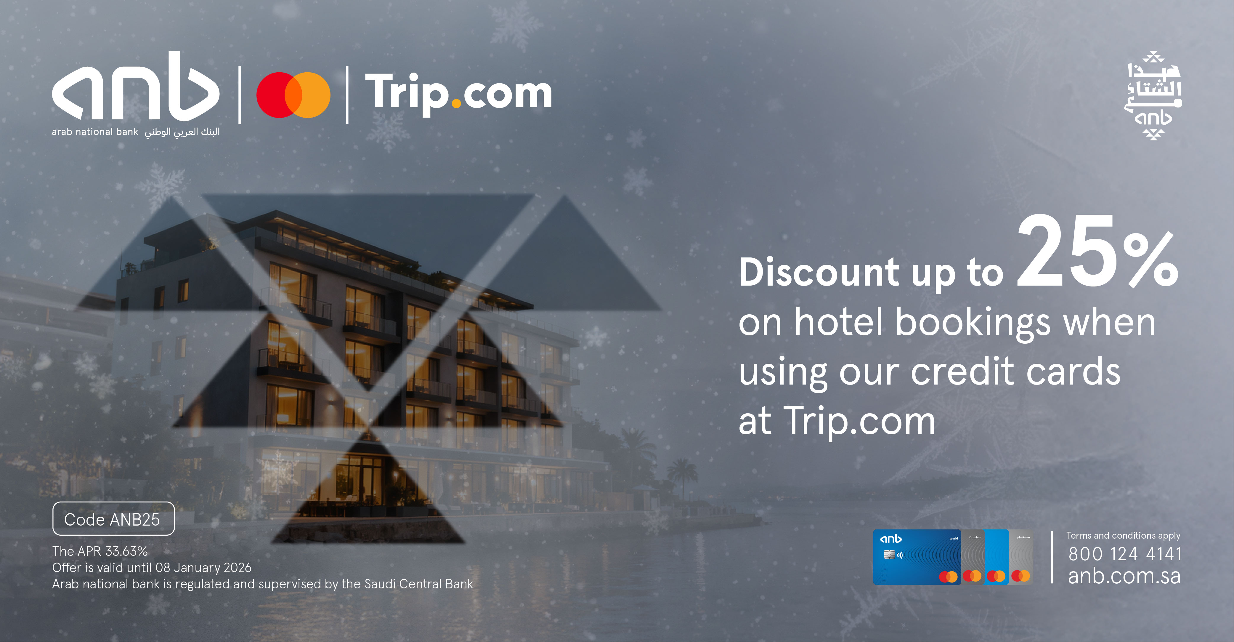 anb Mastercard credit card holders are eligible for a 25% discount on hotel bookings up to SAR 500 and 10% discount on Flight bookings up to SAR 300 made via the Trip.com mobile app or website (SA).